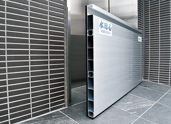 水用心はトラック部材を応用して作られた止水板です。止水板内部に水が入り込んで浮力が発生しないためその他の抑え金具は不要です。導入しやすい価格でかつ簡単に施工を行うことができ、有事の際には少人数で設置が可能です。
