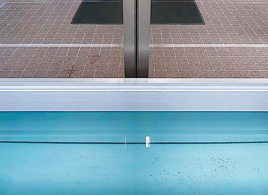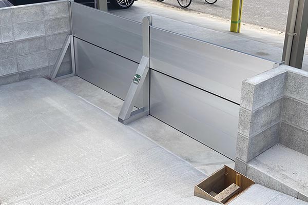 支柱をドリルビス等で既存のドアやシャッターに固定し床面、壁面の隙間をコーキング処理するだけで特殊な工具は不要です。現地に合わせ止水板の幅はアレンジ可能です。また、ドア種類によっては施工は不要になります。