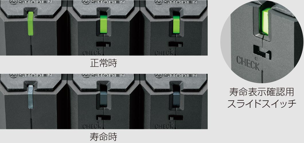 SPDの正常/寿命がわかる状態表示を搭載しています。電源コンセント用はLED表示、LAN用、TV用は機械式の表示です。