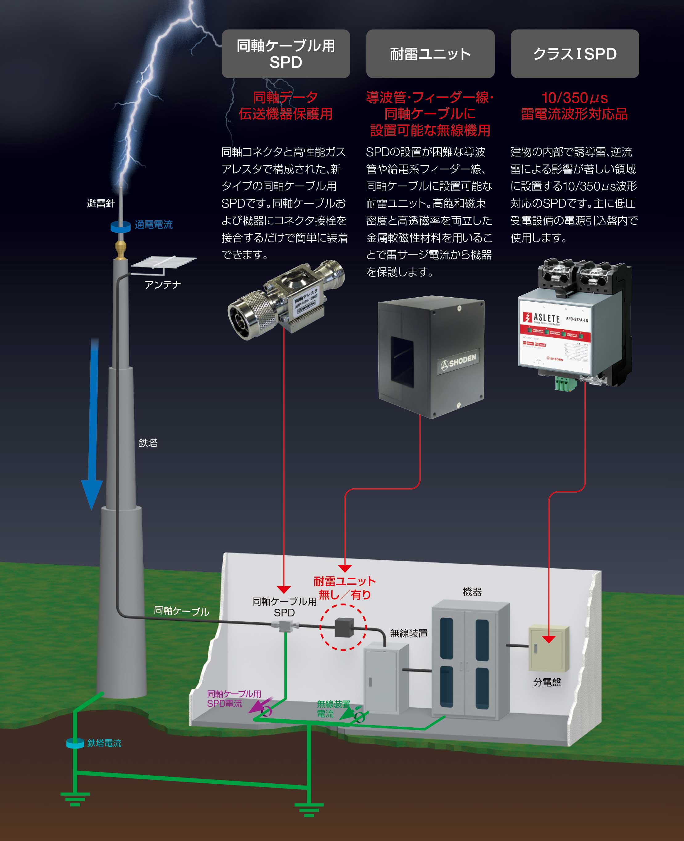 落雷の危険性が高い無線基地局を直撃雷から保護し、局舎内の通信機器を過電圧・過電流から保護するシステムをご提案します。