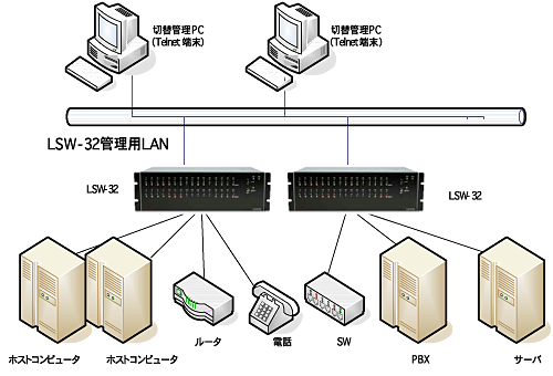 品名LSW-32は、UTP(10/100/1000)および、アナログ、ディジタル2W/4Wを接続し、ルートを切替ます。切替操作は、IP経由にて操作可能です。また、シリアル経由でも操作可能なため、制御の二重化が可能です。内部の切替リレーはラッチ式リレーを採用しているため、機器電源が断となった場合も、接続状態は保持されるため、本製品を導入してもシステムの信頼性が低下しません。